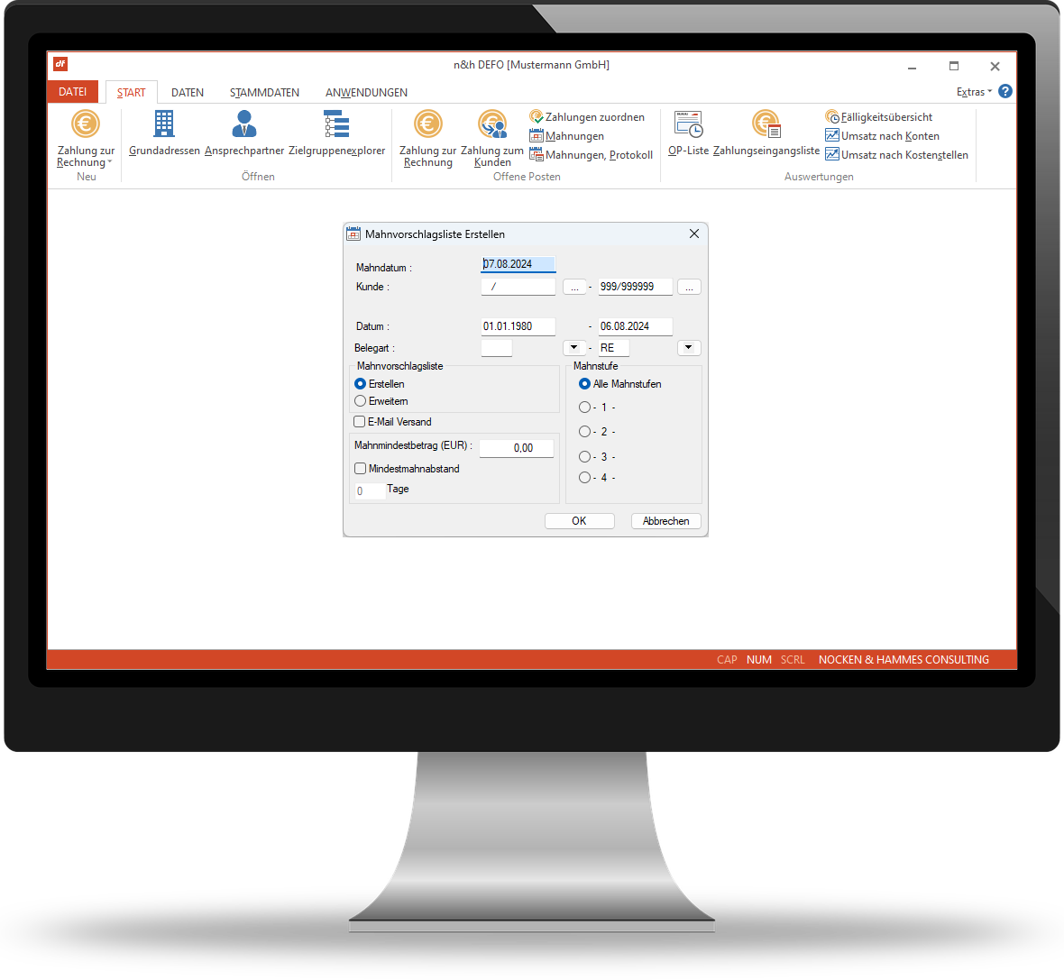 Wenn Sie in Ihrem Hause (zunächst) keine Finanzbuchhaltung einsetzen wollen, übernimmt die n&h DEFO auch die Kontrolle und Überwachung des Zahlungseingangs: