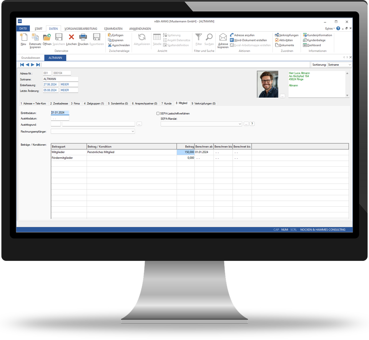 n&h MGL ist in n&h AMAS integriert. Die Anschrift eines Mitgliedes ist sowohl Mitglieder- als auch Marketing- und Kundenadresse, so dass eine doppelte Datenhaltung entfällt.